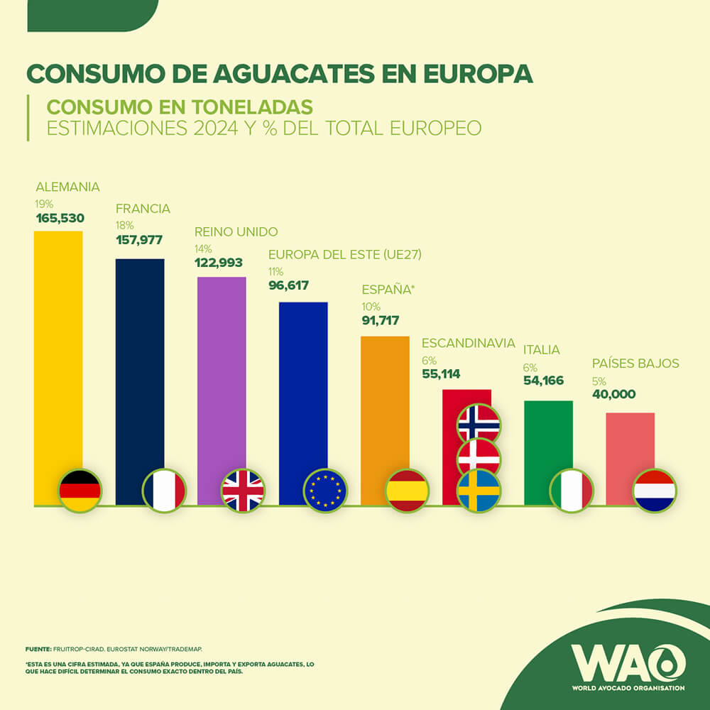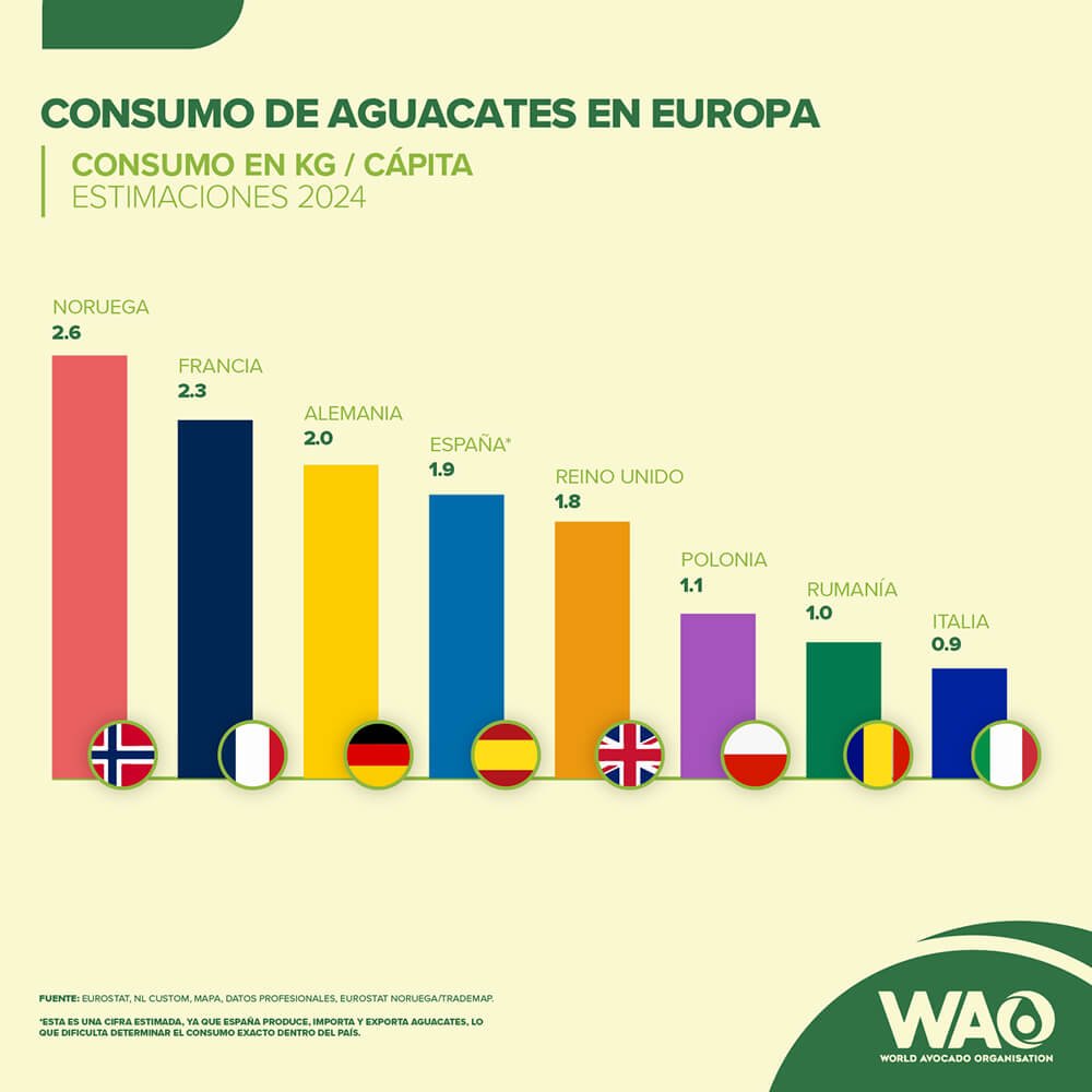 Los principales países productores (Perú, Colombia, Chile y Sudáfrica) representan alrededor del 75% del total de las importaciones europeas de aguacates.