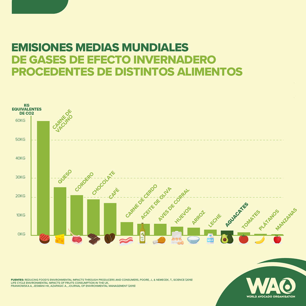 Refiriéndose a la cantidad total de gases de efecto invernadero generados durante el ciclo de vida de un producto, la huella de carbono de los aguacates es alrededor de 25 veces menor que la de la carne de res, 10 veces menor que la del cordero o el queso, 7 veces menor que la del café y comparable a la de otras frutas.