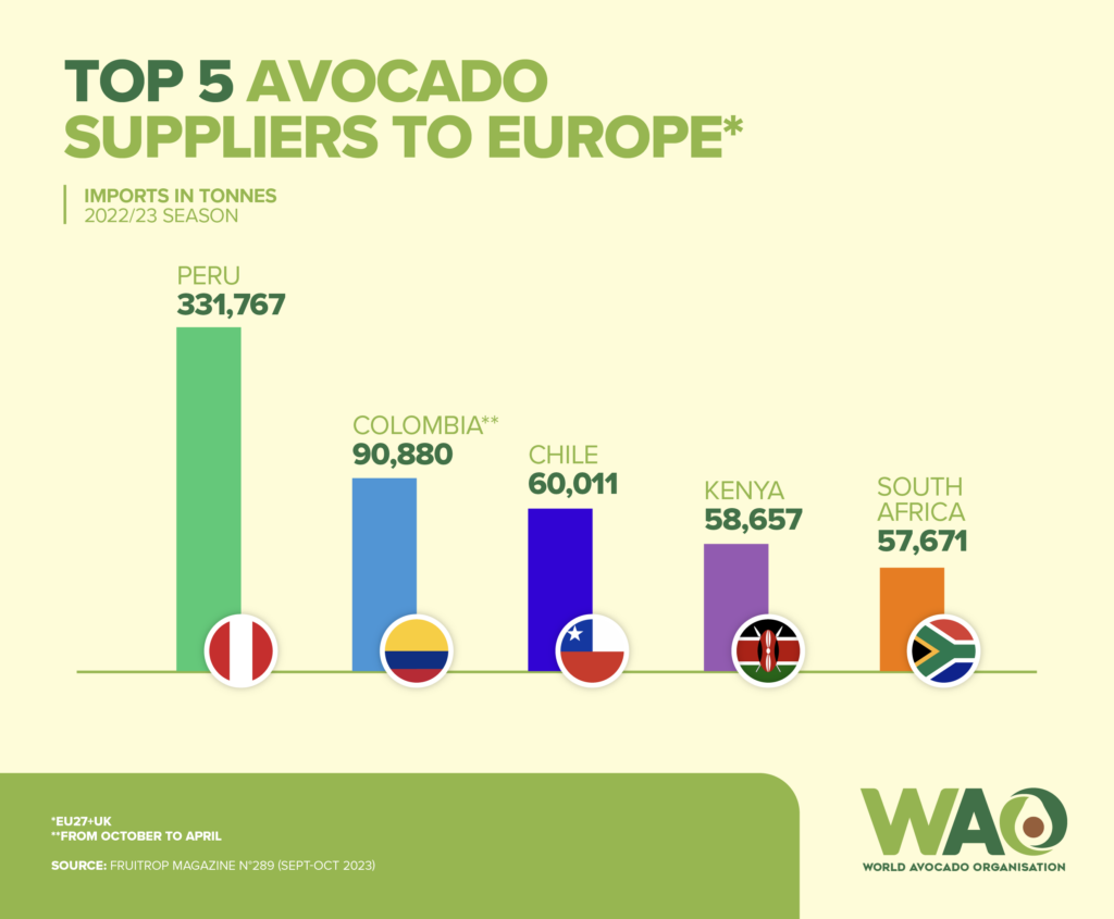 As a matter of fact, Peru is the biggest supplier of avocados to Europe, with a staggering 331,767 tonnes arriving in the 2022/23 season (in contrast, only 38,000 tonnes came from Mexico). Colombia came in second place with 90,880 tonnes,followed by Chile at 60,011 tonnes, Kenya at 58,657 tonnes, and South Africa in fifth place at 57,671 tonnes.