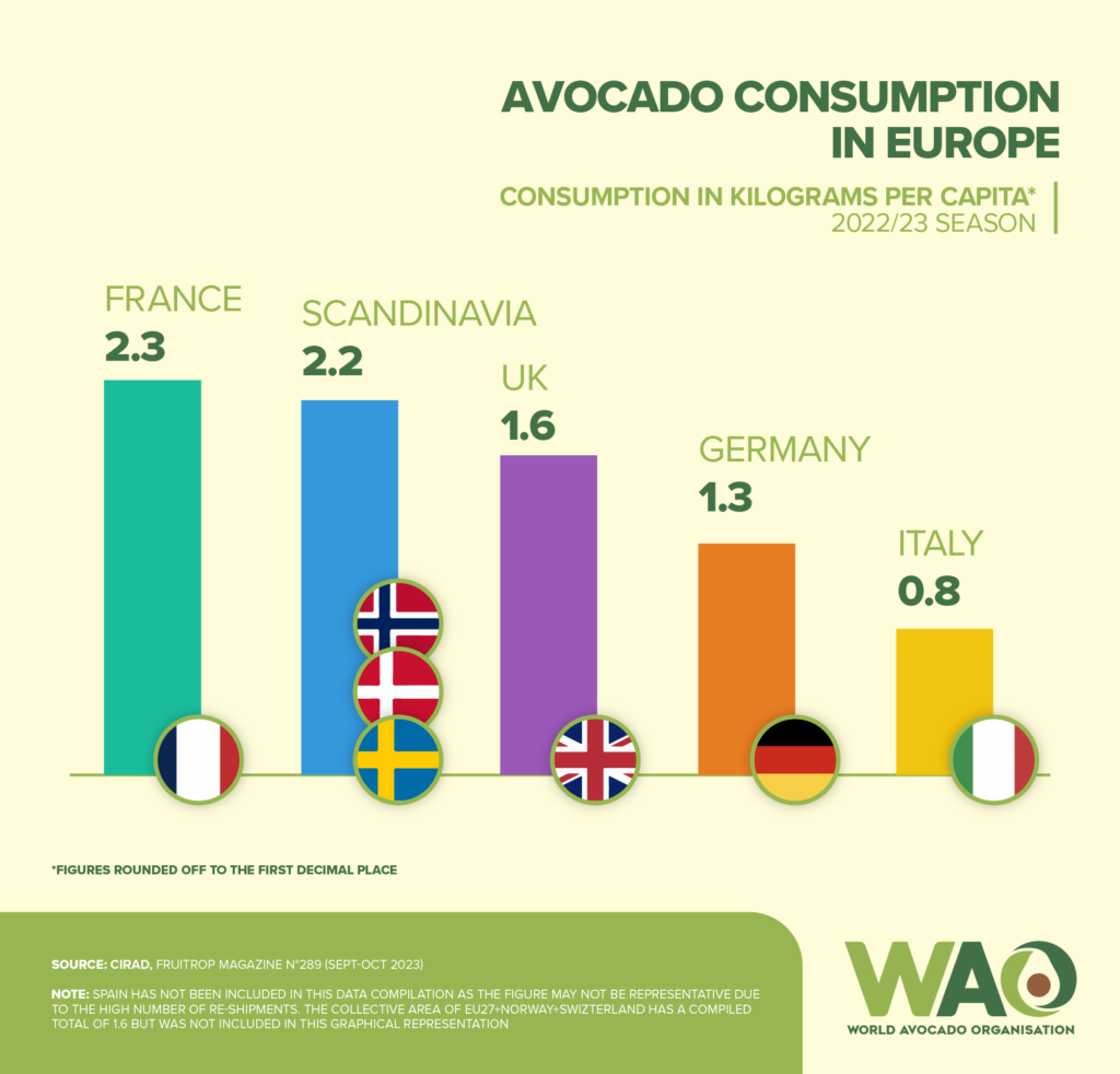 But what does this mean? If we look at the consumption per capita results, France again comes out on top as the European country consuming the most avocados at 2.3kg per person in 2022/23. Though the UK and Germany rank second and third in total volume, Scandinavia bypasses both countries when considering consumption per person. Scandinavians consumed 2.2kg per person on average. In comparison, the average Brit devoured 1.6kg, the average German ate 1.3kg, and in Italy, 0.8kg. Compared to last year, slight increases can be noted in France, the UK and Italy, while Germany continues to be consistently plating up their avocados this year.[2]