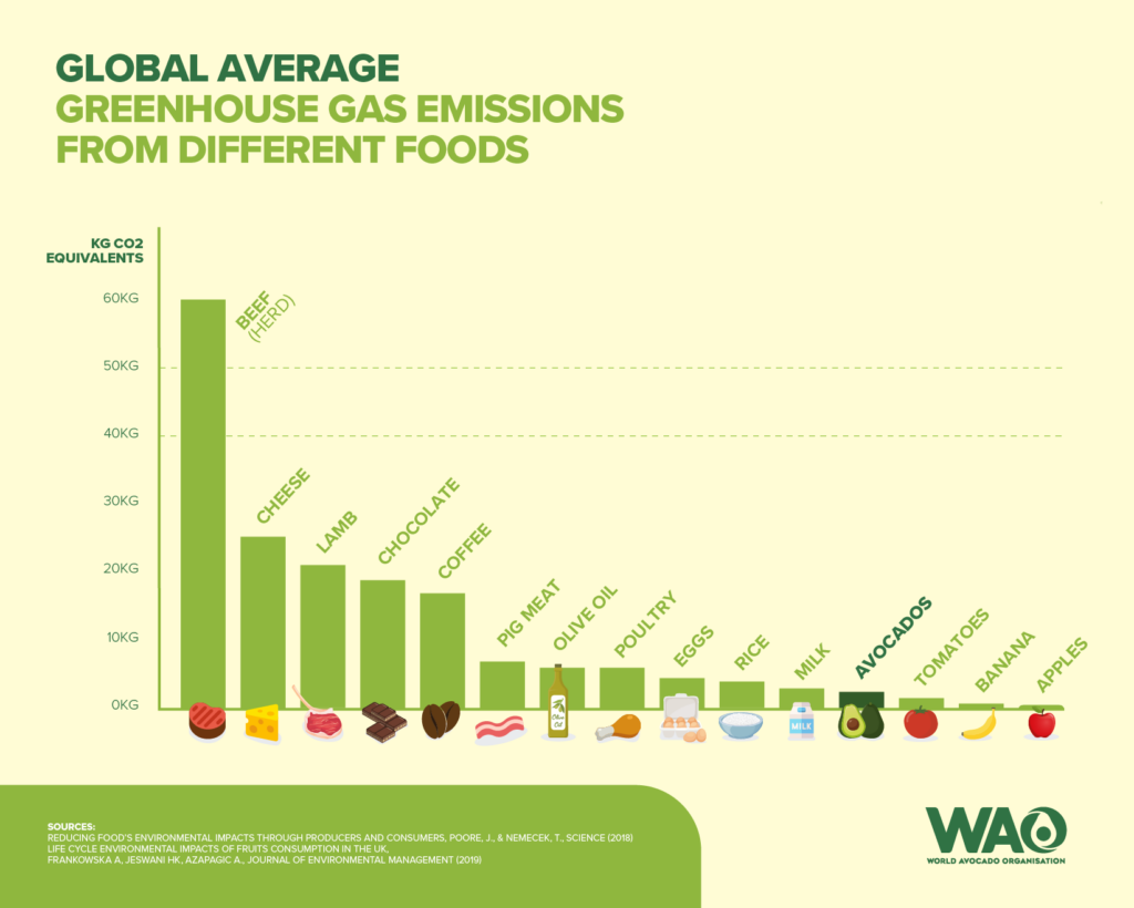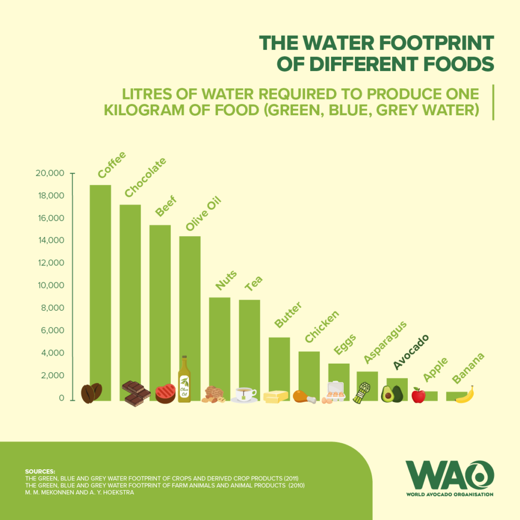 While water consumption can be a contentious issue, the truth is that avocados consume more or less the same water as other fruits and vegetables, and far less than many very popular foods. Studies have shown that avocados have a total average water footprint of around 800 litres per kilogram and just 2.4 kg of CO2 emissions per kilogram, Avocados use roughly 8 to 10 times less water than beef, chocolate and coffee and produce 25 times fewer greenhouse gases than beef, 10 times less than cheese, and about the same as that of other fruits.