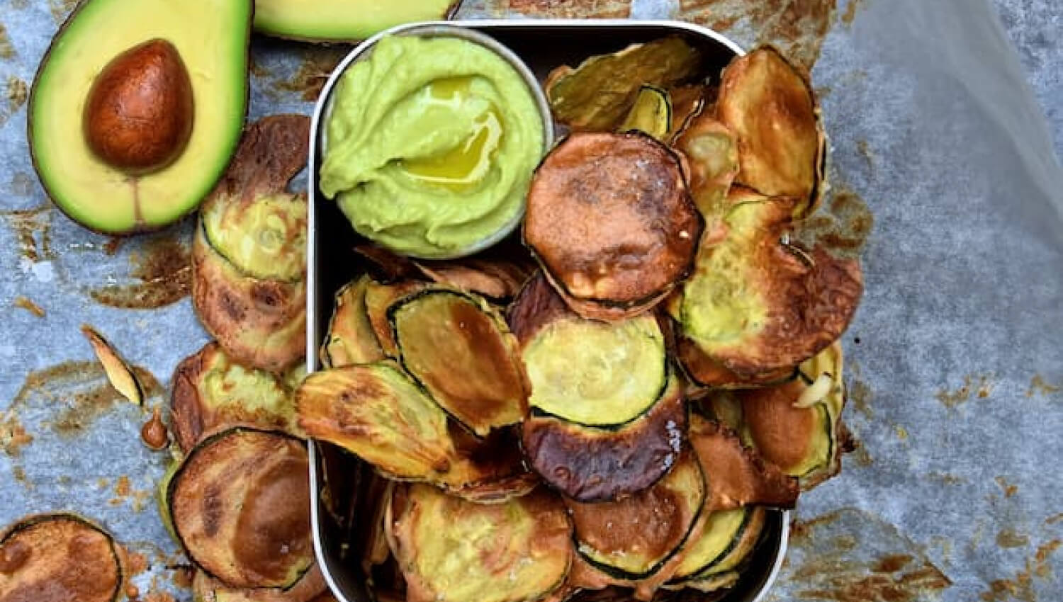 Diese knusprigen gebackenen Zucchini-Chips sind perfekt gepaart mit einem reichen, knoblauchigen Avocado-Aioli – „Avioli“ – für einen gesunden, geschmackvollen Snack, in dem cremiges Avocado im Rampenlicht steht.