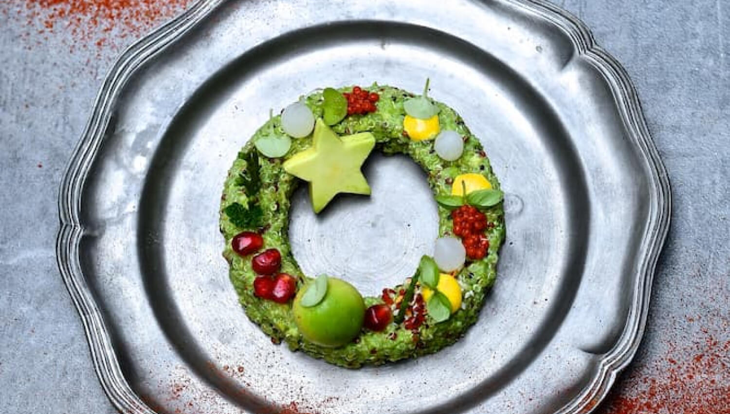 Dieser festliche Quinoa-Weihnachtskranz präsentiert cremiges Avocado, gemischt mit Limette und Quinoa, schön geformt und garniert für ein lebendiges, feiertagsbereites Gericht, in dem Avocado im Mittelpunkt steht.