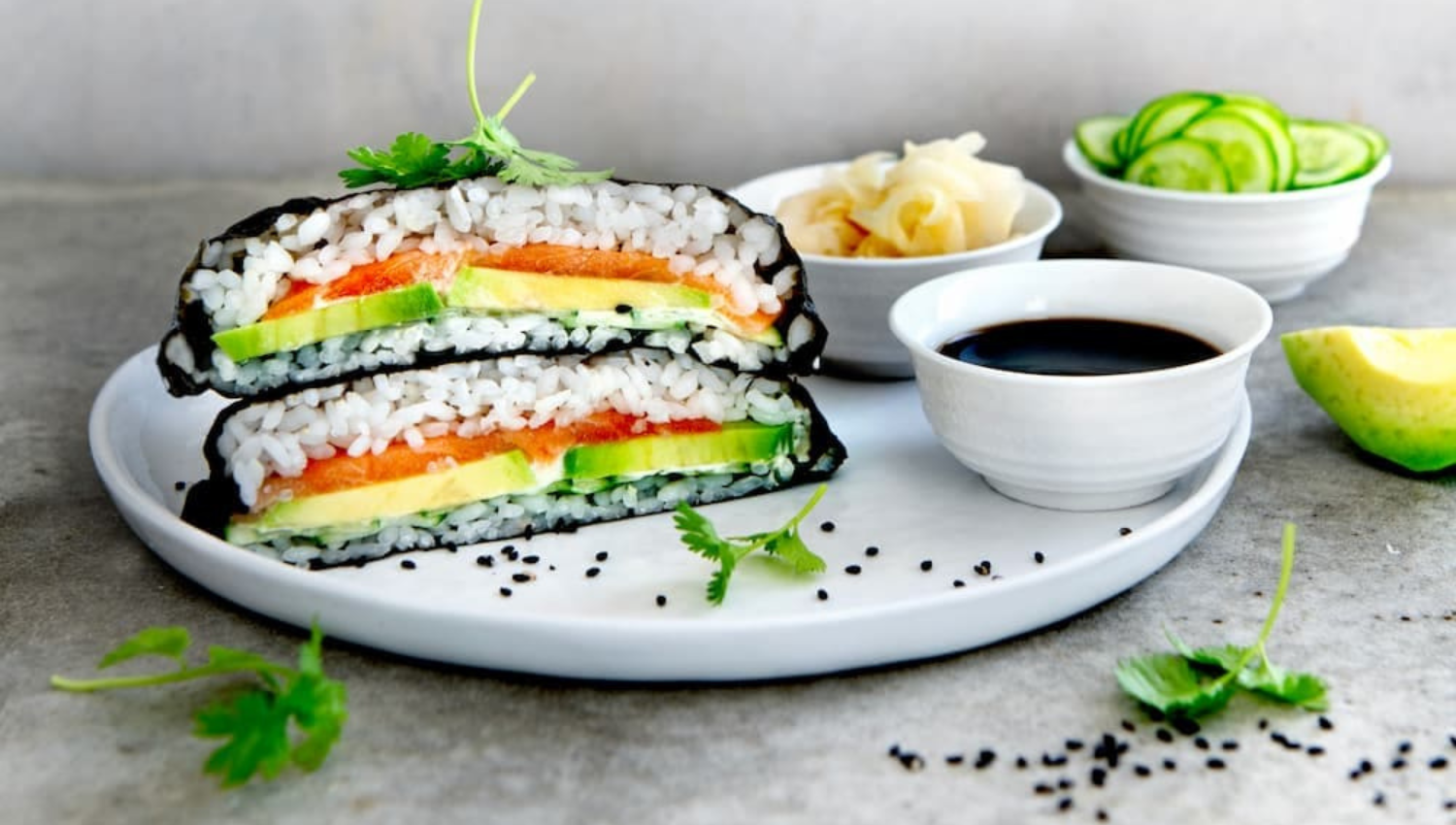 Sushi-Sandwich mit Avocado, Lachs und Ingwer-Mayonnaise
