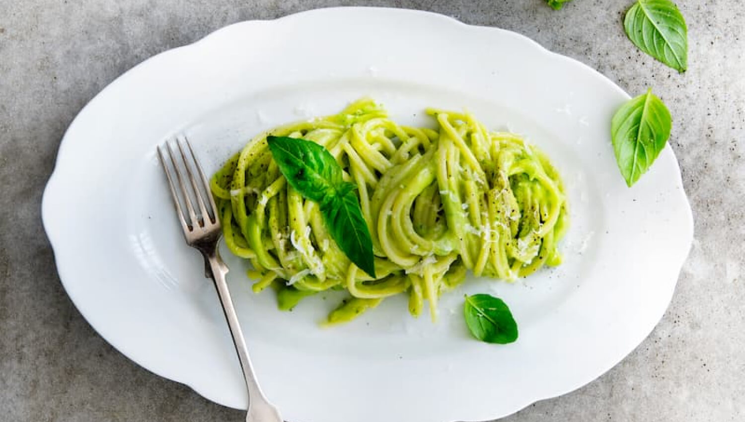 Dieses einfache, aber luxuriöse Spaghetti-Gericht präsentiert eine samtige Avocado-Sauce, gemischt mit Basilikum und Knoblauch, belegt mit Parmesan für eine frische, cremige Variante klassischer Comfort Food.