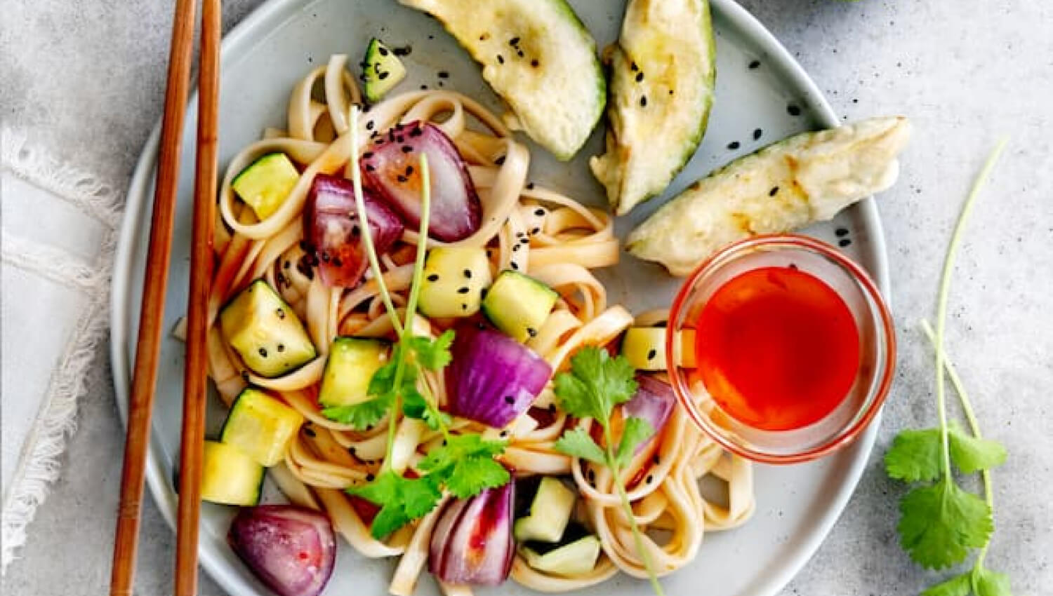 Diese Sweet-Chili-Nudeln werden mit gerührtem Gemüse geworfen und mit knusprigem Avocado-Tempura belegt, das das cremige, goldgebratene Avocado in jedem würzigen, säuerlichen Bissen die Show stehlen lässt.