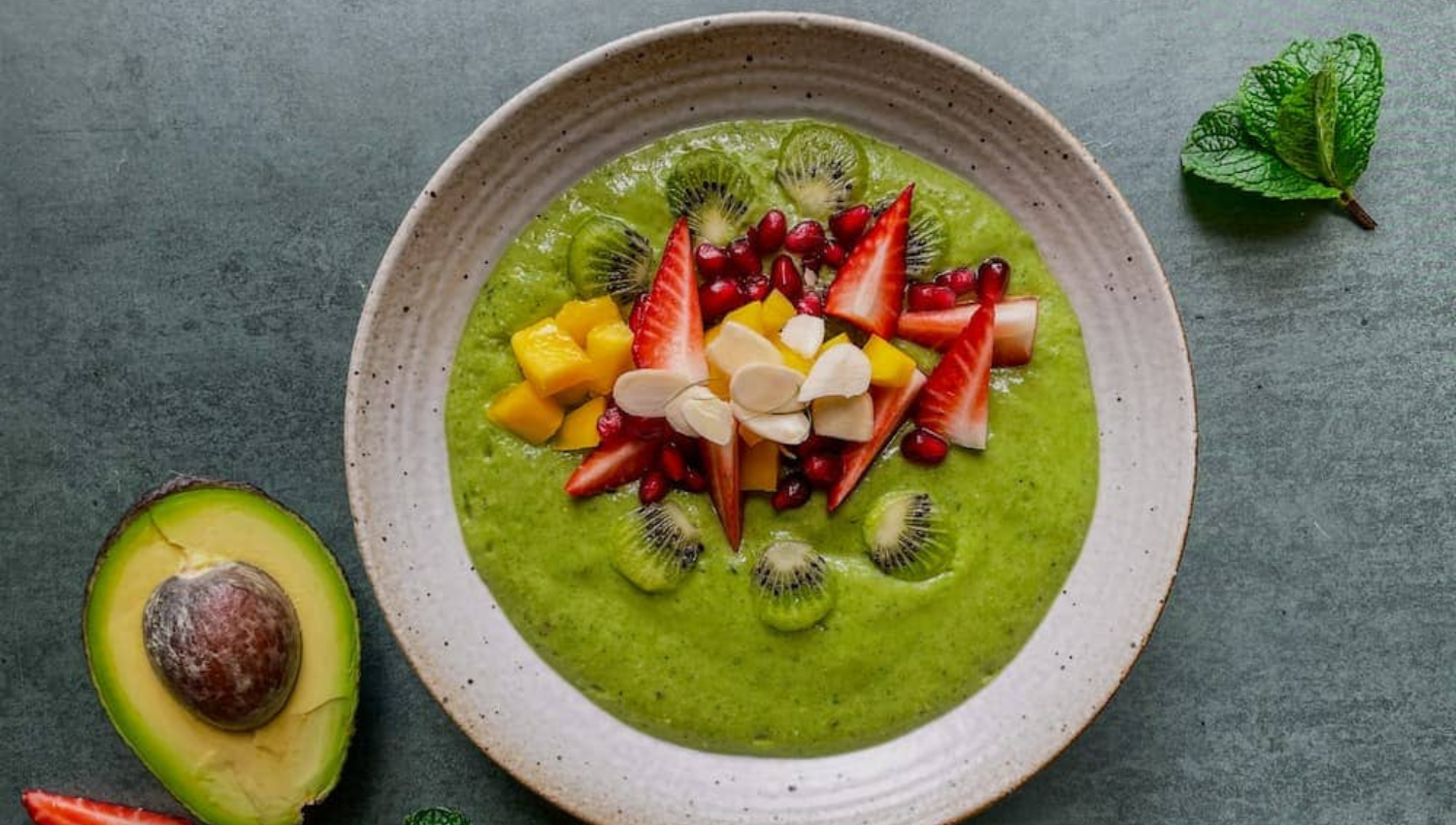 Diese nährende Avocado-Power-Bowl mischt cremiges Avocado mit Mango, Spinat und Banane, dann belegt mit frischem Obst und Nüssen für eine lebendige, energieboostende Mahlzeit.