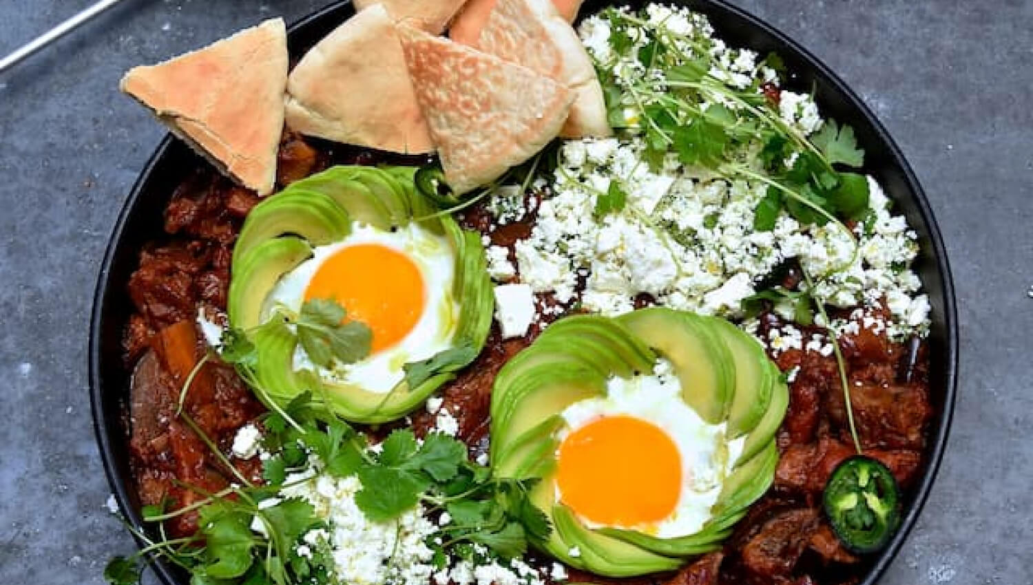 Diese kühne Variante des Shakshuka präsentiert cremige Avocado-Rosen, die gebackene Eier in einer reichen, gewürzten Tomaten-Auberginen-Sauce wiegen.