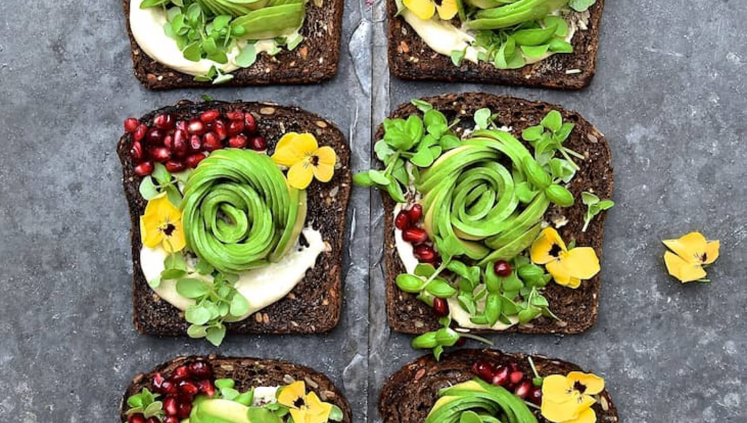 - Das getoastete Brot mit den Avocadoröschen und der Tahinicreme belegen. Ggf. mit Granatapfelkernen, Basilikum, Kresse und essbaren Blüten garnieren.
