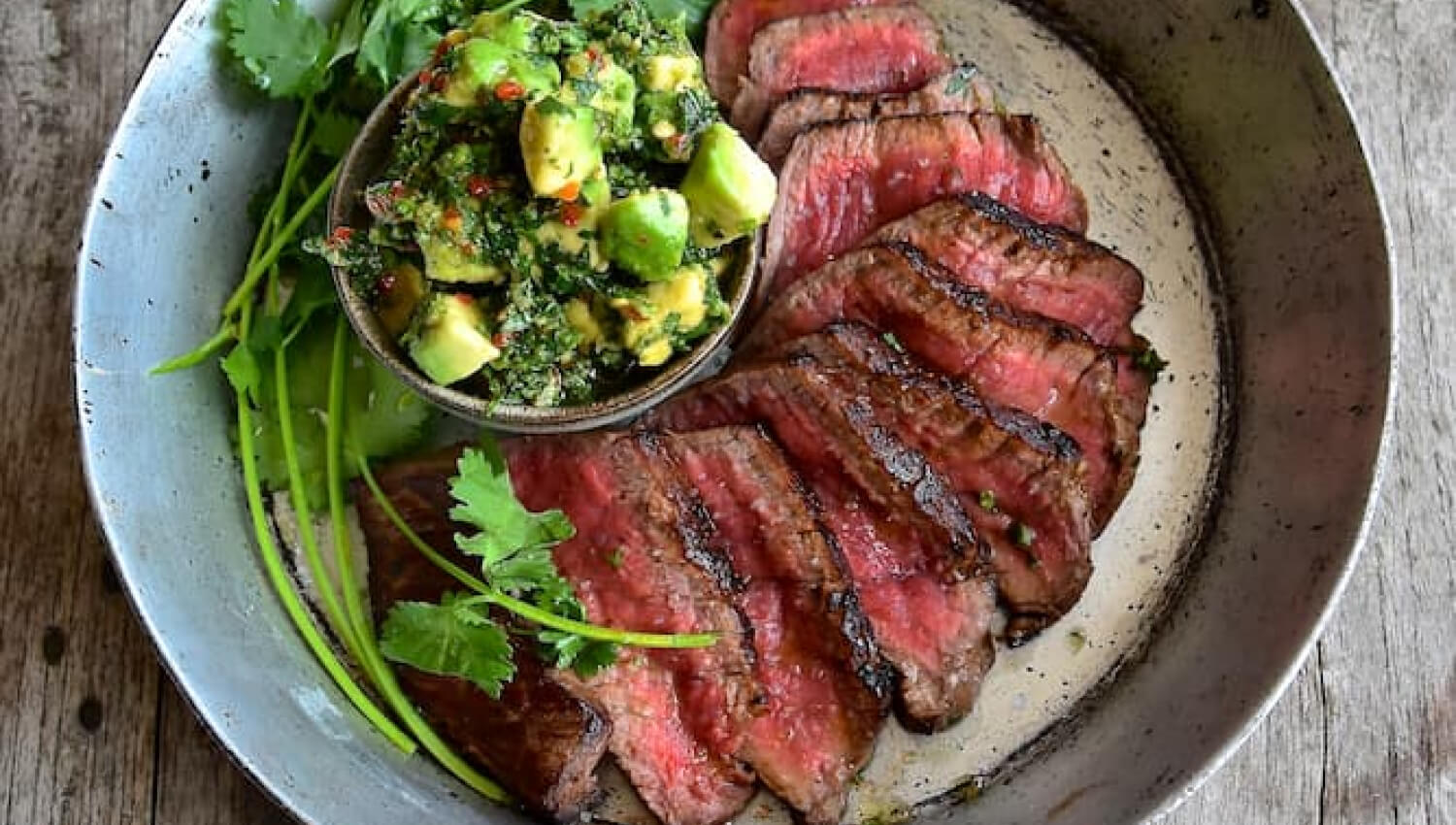 - Das Steak nach Belieben auf dem Grill zubereiten. Das gegrillte Steak in dünne Scheiben schneiden und nach Belieben würzen. Auf einem Teller servieren (oder wie auf dem Foto abgebildet direkt in der Pfanne), mit dem frischen Chimichurri und einigen extra Zweigen Koriander.
