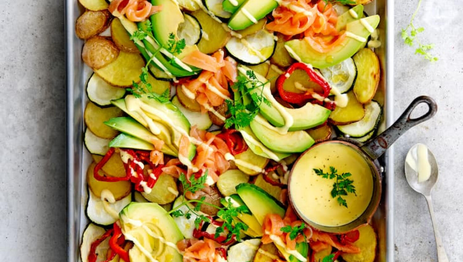- Das Backblech aus dem Ofen nehmen. Die Avocado und den Lachs auf dem Backblech verteilen. Etwas Sauce Hollandaise darüber geben und mit den Kräutern bestreuen. Den Auflauf mit dem Rest der Sauce servieren.