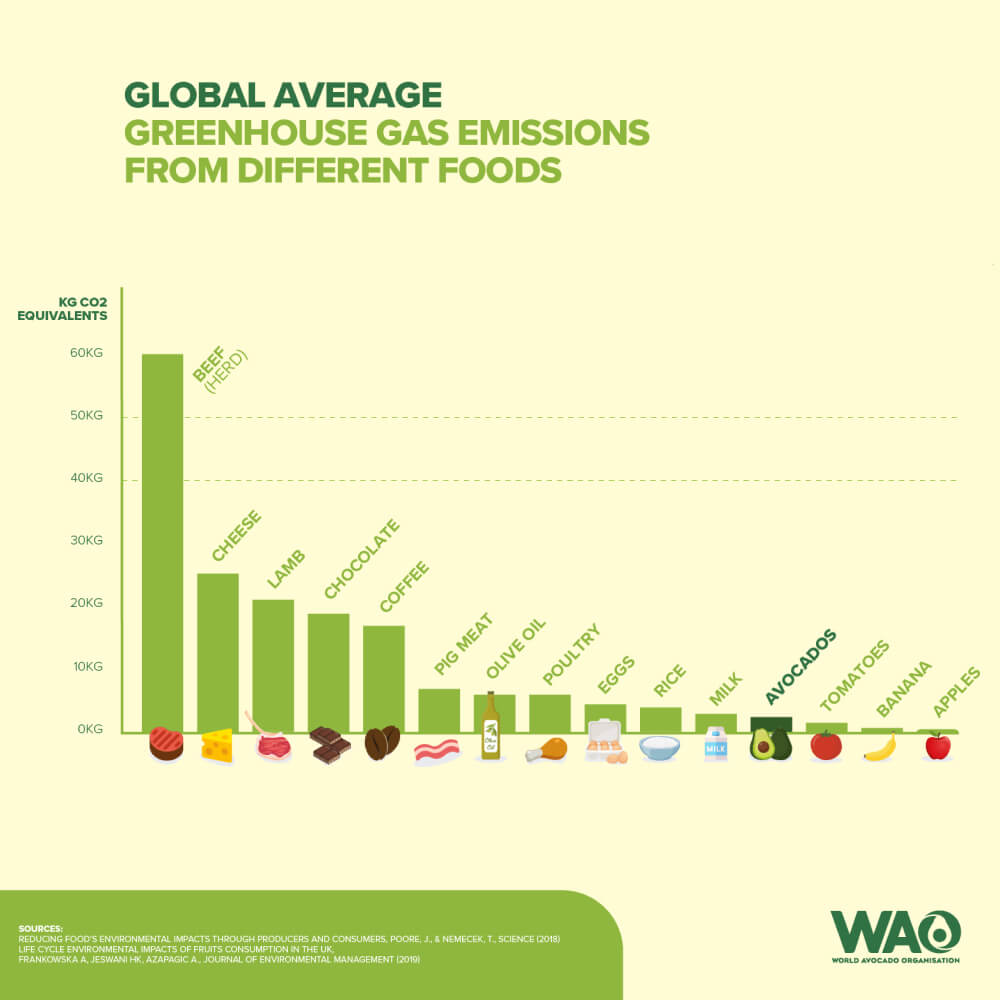 Referring to the total amount of greenhouse gases generated during the lifecycle of a product, the carbon footprint of avocados is around 25 times less than that of beef, 10 times less than lamb or cheese, 7 times less than coffee, and comparable to that of other fruits.